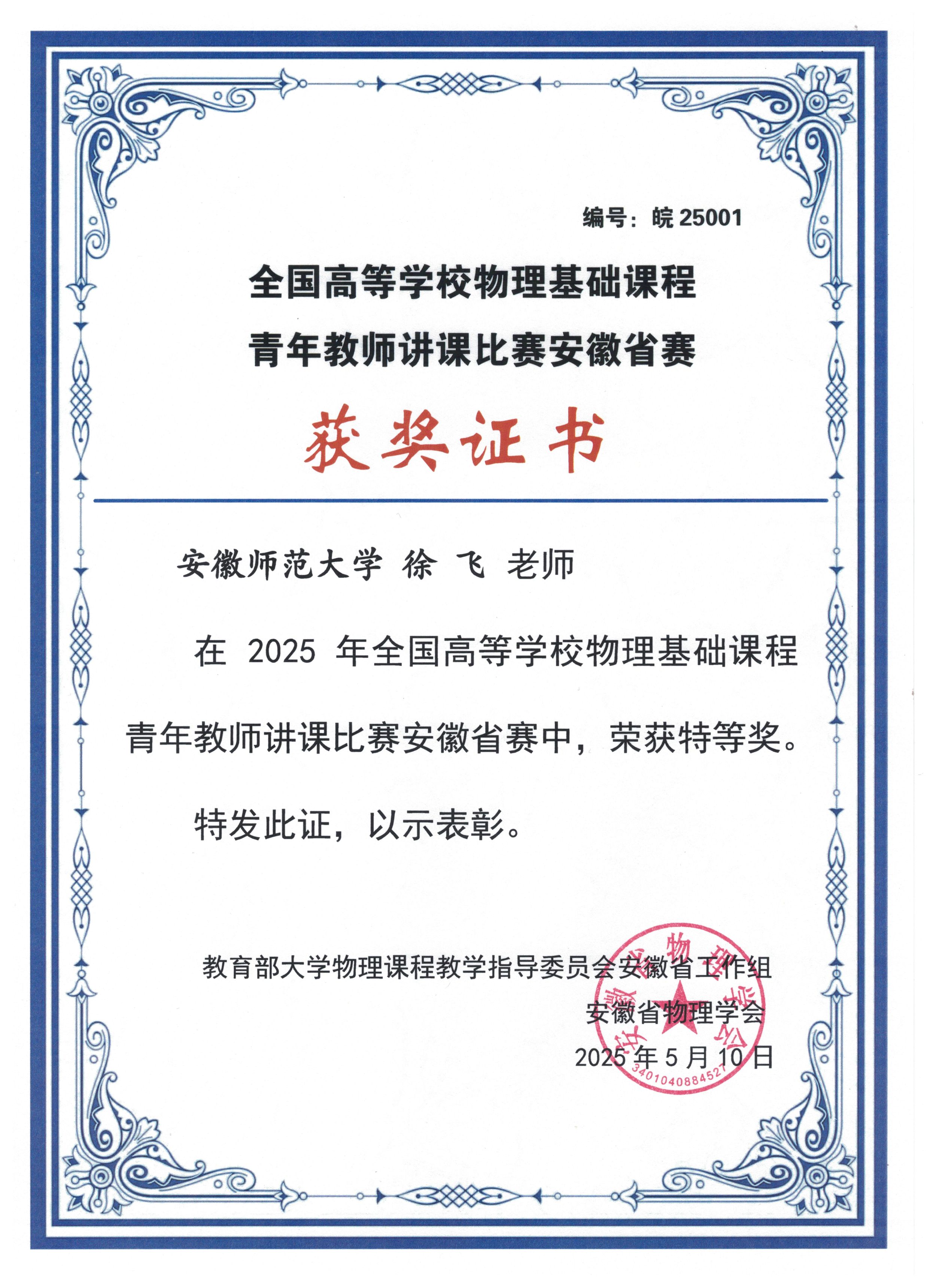 本次比赛由教育部大学物理课程教学指导委员会安徽工作委员会、安徽省物理学会共同主办,安徽大学承办。比赛汇聚了安徽省二十余所高校物理基础课程的优秀青年教师,竞争异常激烈。徐飞老师在备赛过程中,精心设计教学方案,反复打磨教学环节,力求将物理知识以生动、易懂且富有启发性的方式呈现给学生。比赛中,他以扎实的专业知识、严谨的教学态度、灵活多样的教学方法以及富有感染力的教学风格,充分展示了免费色情片