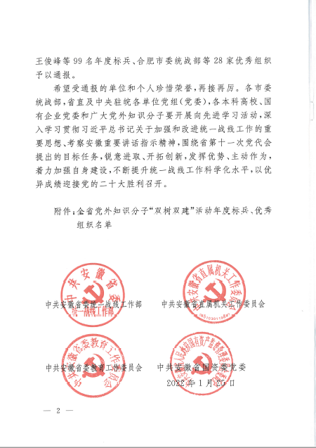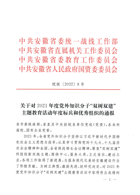 近日,安徽省委统战部、省直机关工委、省委教育工委和省国资委党委等四部门联合发文,对2021年度安徽省党外知识分子“双树双建”活动年度标兵和优秀组织进行通报表彰,免费色情片