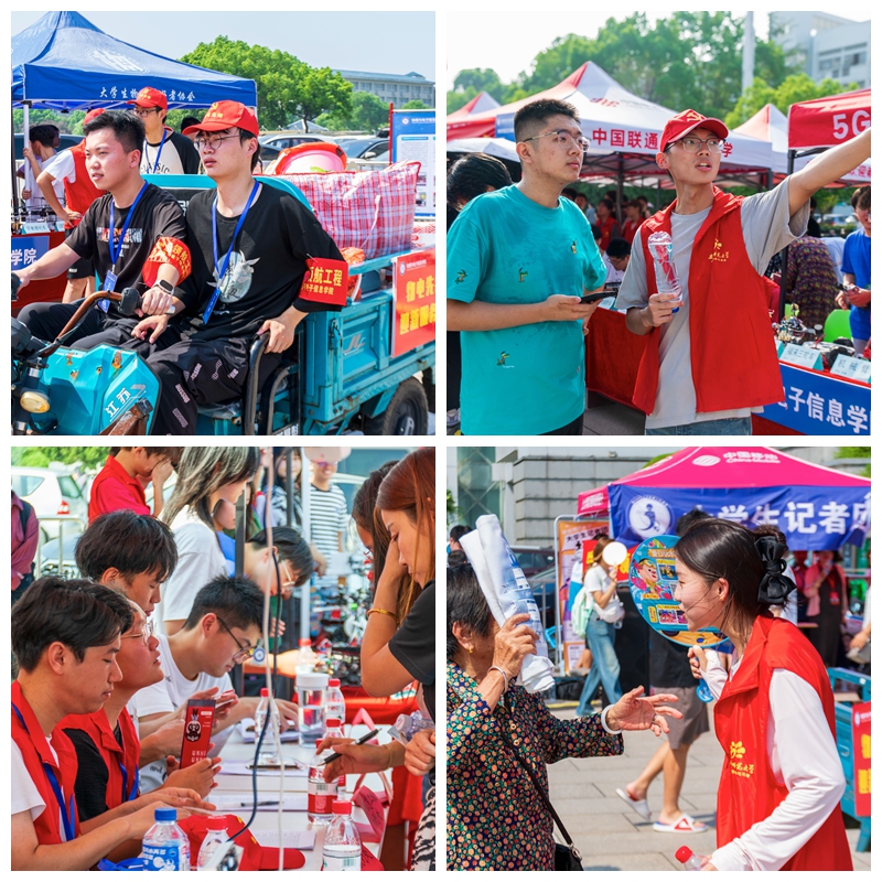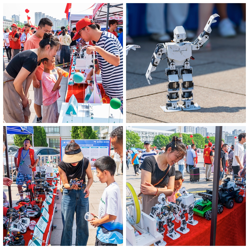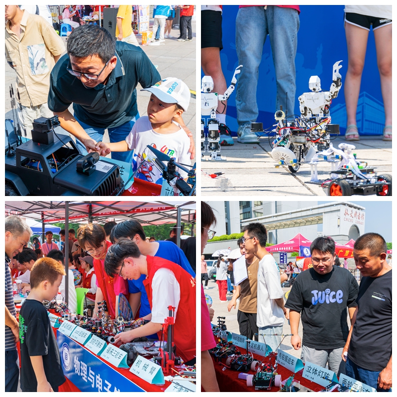 迎新现场,学术科技作品展台上展示着物电学子制作的科技作品,从工科学生研制的能歌善舞的机器人、风驰电掣的智能汽车、5G远程驾驶智能车到物理师范生自制的磁感应强度探究仪、法拉第电磁感应定律演示仪、光的折射探究仪等物理教具,通过学生志愿者专业演示与讲解,让新生们在展览中感受学科魅力,对自己所学专业有了进一步的认识。此外,学院学团组织简介、育人品牌项目、2024届考研光荣榜、学科竞赛光荣榜等宣传内容也在潜移默化中让专业思想教育加深加固。
