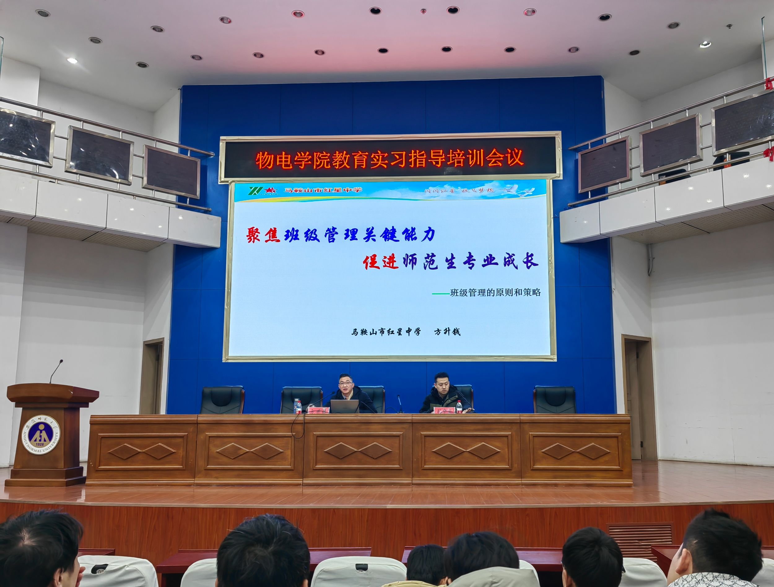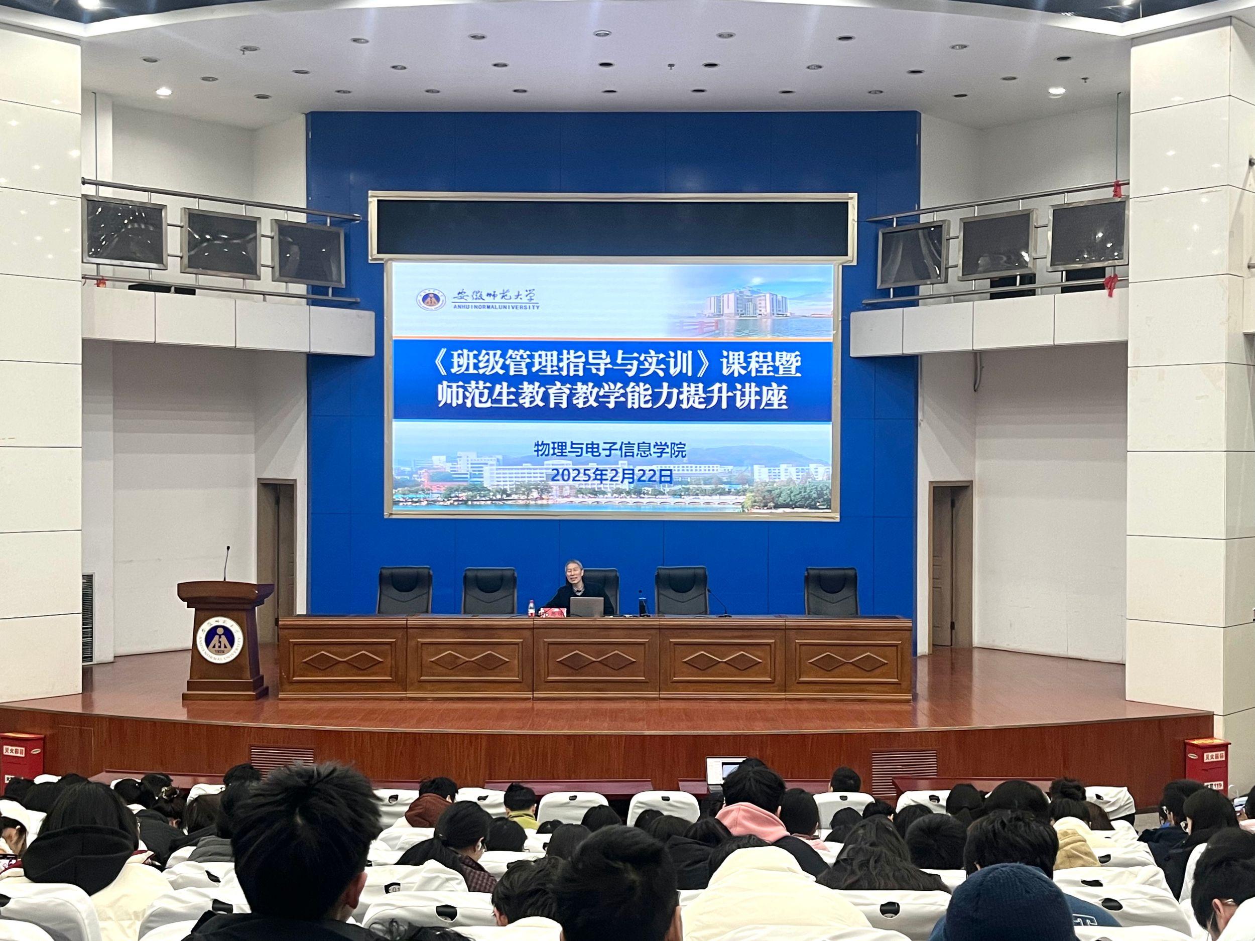 在敬文报告厅举行《班级管理指导与训练》课程暨师范生教育教学能力提升系列讲座。本次活动邀请安徽省教育科学研究院物理教研员、中学特级教师杨思锋以及安徽省特级教师、安徽省首届江淮好班主任、“马鞍山市名班主任工作室”主持人方升钱作为主讲嘉宾,为2022级物理学(师范)专业全体本科生及部分学科教学(物理)专业研究生开展了两场精彩的教学分享。