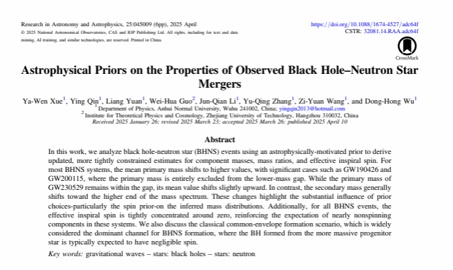 2022级物理学(师范)专业本科生薛雅文以第一作者在《Research in Astronomy and Astrophysics》(天文学和天体物理)发表题为“Astrophysicial Priors on the Properties of Observed Black Hole-Neutron Star Mergers”的研究论文(DOI:10.1088/1674-4527/adc64f),免费色情片