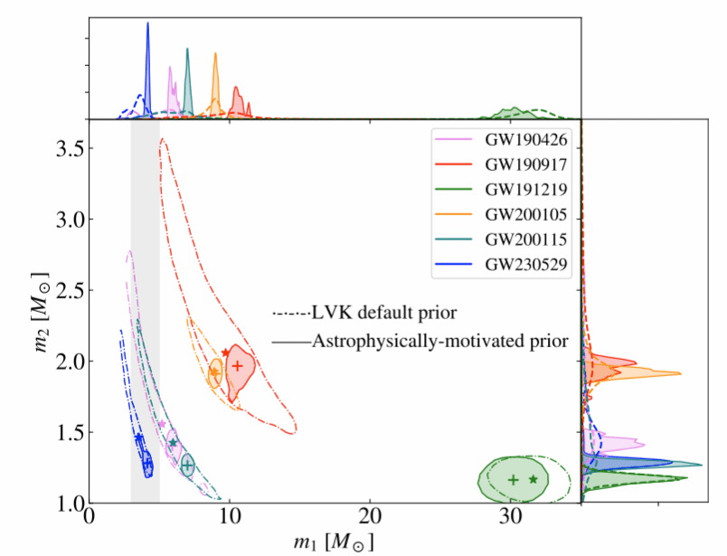 黑洞-中子星系统(BHNS)的并合事件是LIGO、Virgo和KAGRA(LVK)天文台进行引力波探测的主要目标。目前,LVK协作组已经观测到多个BHNS合并事件,包括GW190426、GW190917、GW191219、GW200105,GW200115,以及最新探测到令人关注的GW230529引力波事件。其中GW230529系统里黑洞的质量被推断处在2.5-5.0倍太阳质量,即所谓的质量间隙黑洞。在本项工作中,论文的作者主要分析了这些BHNS并合事件的性质,借助天体物理黑洞的自转先验,通过Reweight方法推断出更为严格约束的相关物理参数(系统的质量、中子星和黑洞的质量比、有效自转)。该结果体现了不同先验对系统性质推断分布推断的重要影响。下图展示了不同先验对BHNS系统质量推断的影响(虚线:LVK默认均匀先验,实线:天体物理先验)。论文的合作者还包含免费色情片