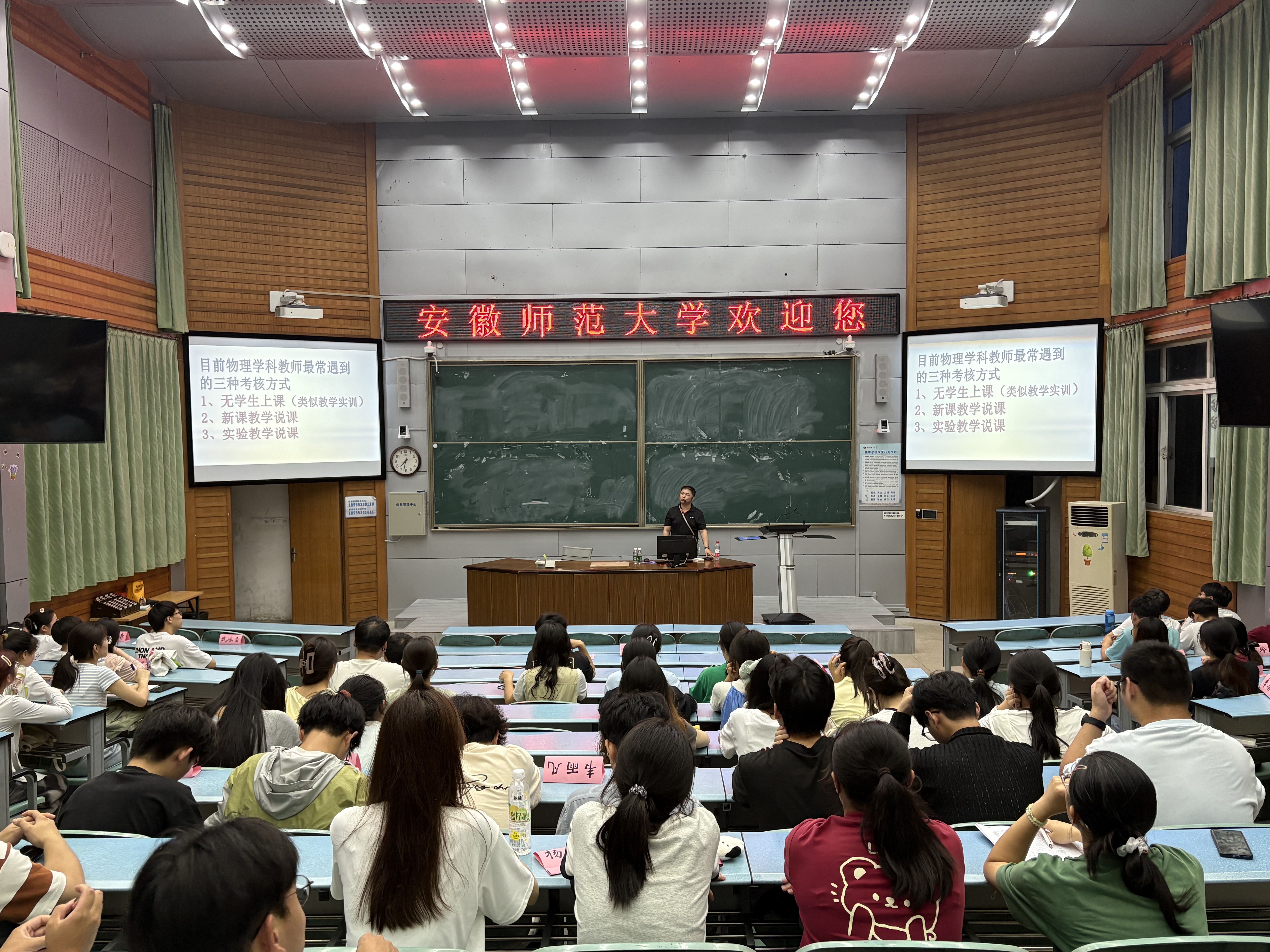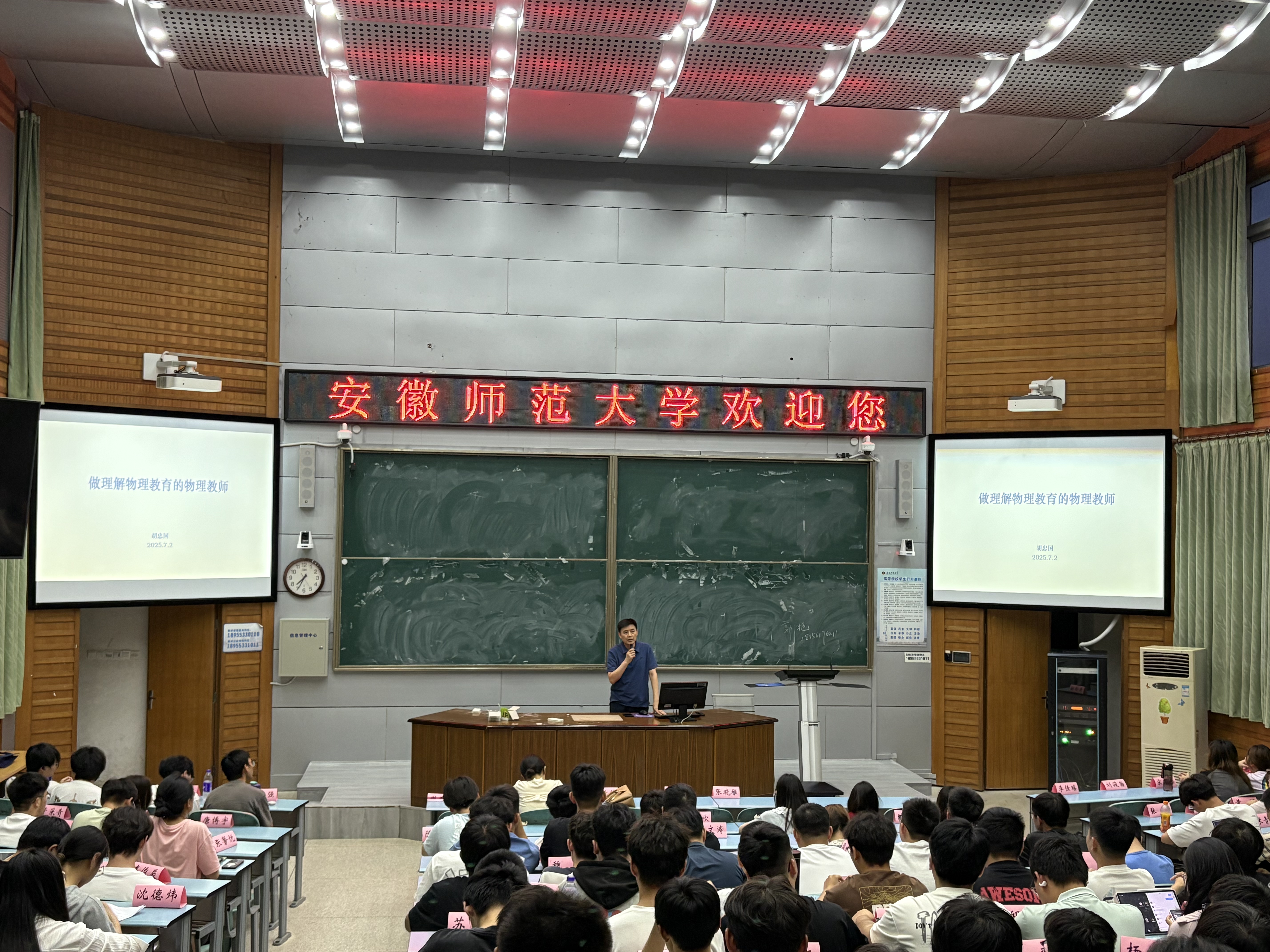 7月2日,胡忠国老师以《做理解物理教育的物理教师》为题,以“外星人学物理”为引,深入浅出地阐述了物理教育不止于公式推导与实验操作,更需穿透知识表象,触及科学思维本质。他谆谆教导同学们要从物理的学科逻辑和学生的认知规律出发,让物理课更有物理味,勉励同学们不断精进课堂教学,努力提升教育教学实践能力,成长为一名优秀的人民教师。胡忠国老师娓娓道来,言语之间充满了对学生的关怀,对后辈的期许。同学们认真聆听,仔细记录,并在讲座后与胡老师互动交流,加深理解。