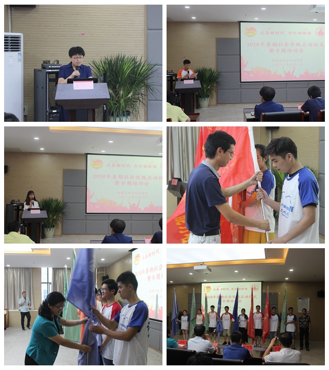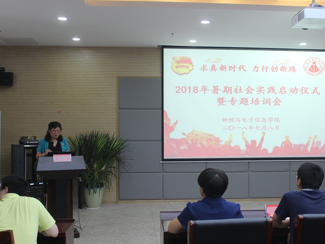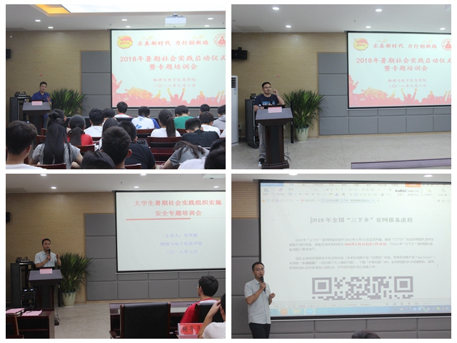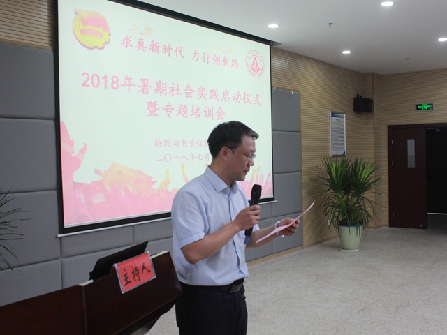 在理化大楼304报告厅隆重举行2018年暑期社会实践启动仪式暨专题培训会。校团委副书记汪凯,校教务处副处长崔光磊,暑期实践思政指导老师李新,学院党委书记李娟、副书记吴长义、副院长张其芳,指导教师代表丁绪星、汪志荣、刘小明、甘露,全体专兼职辅导员以及实践团队代表参加了启动仪式。仪式由院团委负责人宋凤楼主持。