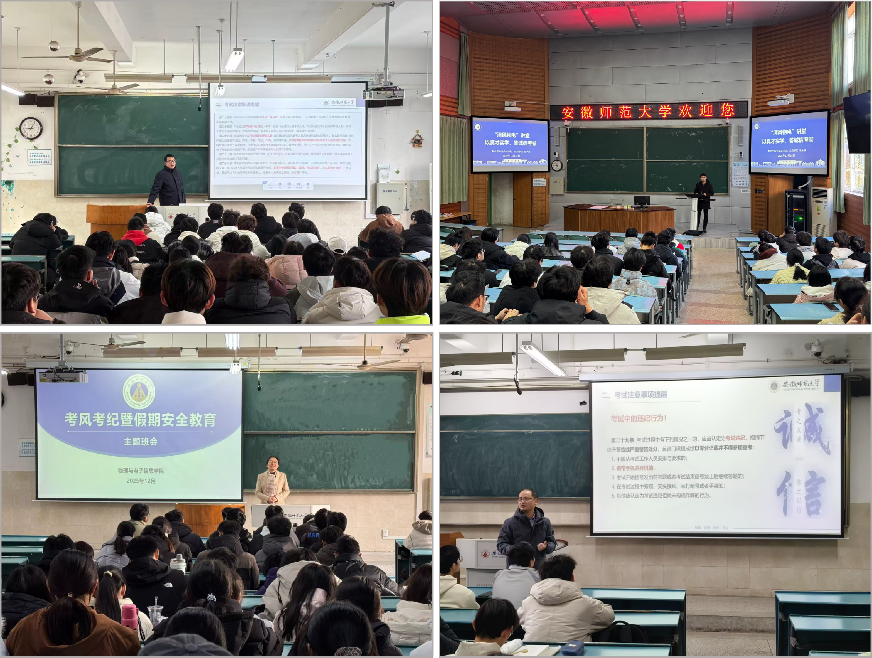 专题教育铸魂,夯实思想根基。学院将考风考纪建设与安全教育列为期末重点工作,成立考风考纪工作领导小组,严格落实“党政领导考场督察、辅导员全程巡考”制度。依托“四联系” 机制,领导班子成员深入班级开展主题宣讲,通过解读作弊典型案例、重温《学生手册》考纪规定,引导学生树立“诚信应考、违纪必究”意识;同步围绕人身、财产、消防、交通等安全领域开展预警教育,筑牢思想“双防线”。
