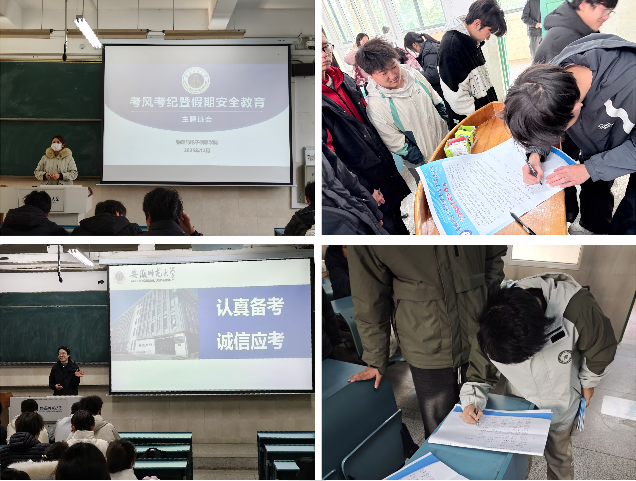 践诺守诚立心,涵养考风氛围。各年级辅导员全覆盖开展考风考纪暨安全教育主题班会,提醒学生规避风险、坚守诚信与安全底线。班会上,组织学生专题学习《安徽师范大学学生违纪处分规定(修订)》等校纪核心条款,现场组织签署诚信考试承诺书,引导学生向校院班郑重承诺,明确表态将自觉遵守考场纪律,杜绝违规违纪行为。