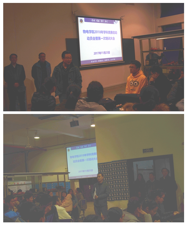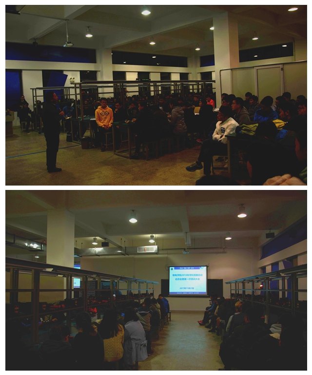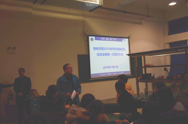 工科实训中心主任蔺玉柱从控制类、信号类、电源类等不同类型课题宣读了2018年培训方案,说明了今年不同时间段不同的培训内容和学习要求。学科竞赛指导老师陶文海从学习的角度给学生做了详细的规划,先利用寒假自学《C语言》、《51单片机》等,下学期开学提前自学《模拟电路》、《数字电路》、《信号与系统》等专业课知识,从基础焊接、组装做起,鼓励大家多交流、多学习、多动手。