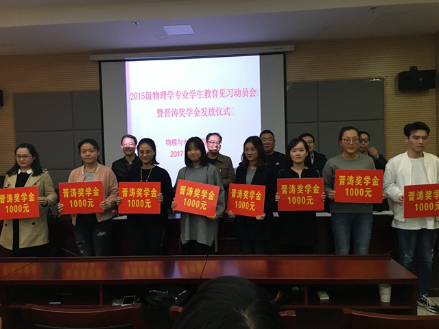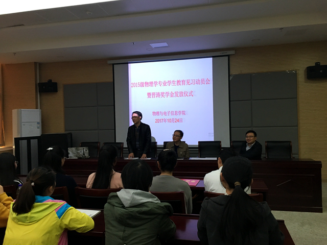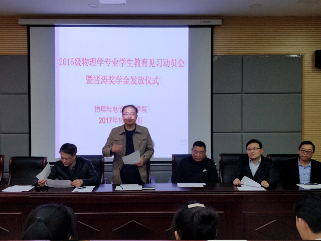 10月24日下午,免费色情片 就见习活动在理化大楼335报告厅召开了见习动员会,为鼓励学生加强师范专业技能锻炼,学院专门设立针对师范专业的奖学金(晋涛奖学金)。晋涛奖学金设立者晋涛,院党委副书记吴长义,教学副院长崔光磊,物理教师教育方向副教授汪志荣、王长江,辅导员徐玲以及2015级物理学专业全体同学参加了“见习动员会暨晋涛奖学金颁发仪式”,活动由汪志荣主持。