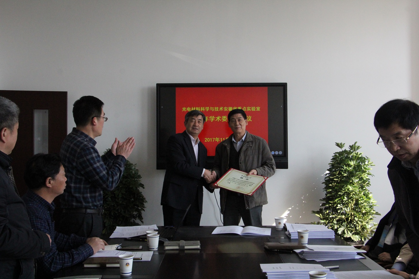 王绍武副校长对出席本次学术委员会会议的各位委员表示热烈的欢迎和衷心地感谢,充分肯定了光电材料科学与技术安徽省重点实验室在科学研究、学科建设、人才培养等方面取得的成果,希望各位委员在重点实验室的建设过程中给予指导和帮助,承诺学校将在人力和财力方面全力支持实验室建设。并为第一届学术委员会委员及实验室主任颁发了聘书。
