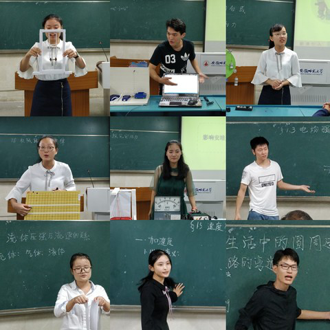 此次竞赛主要考察教学设计、模拟上课和汉字书写三个部分。模拟上课为无生上课,内容由参赛选手自行选定高中或初中的内容,不指定教材。模拟上课时间不超过8分钟。比赛过程中,同学们利用多媒体课件和自制实验器材等对自己所选的课题进行模拟教学展示,同学们精心准备了教学设计,在注重理论阐述的同时兼顾互动环节和实验演示,教学内容丰富多彩,教学过程生动活泼。