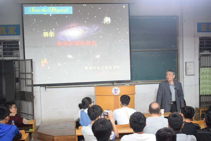 本网讯(16自动化 李文韬)5月5日晚,安徽师范大学第二届终身成就奖获得者陆同兴教授为广大学子在物理楼3401开展了题为《聆听来自宇宙的声音》的讲座,讲座由辅导员秦瑾琼老师主持。