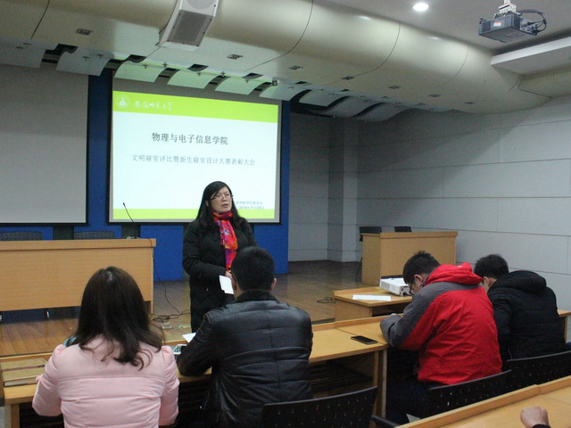 11月25日,学院举行文明寝室与新生寝室设计大赛表彰大会,学院党委书记李娟出席大会并讲话。她指出,学生宿舍是一个社会的缩影,寝室成员要熟悉了解文明寝室是的内容和标准;要制定寝室公约并认真执行;要团结友爱,互帮互助,共同进步。