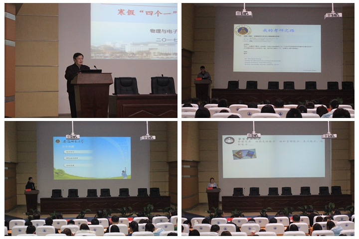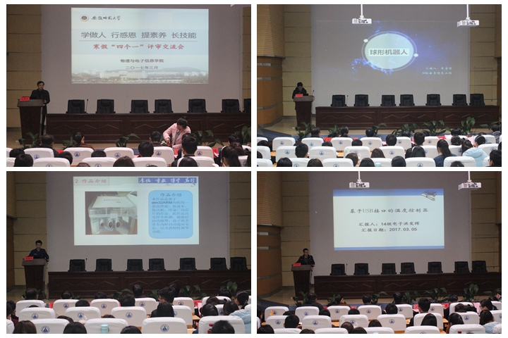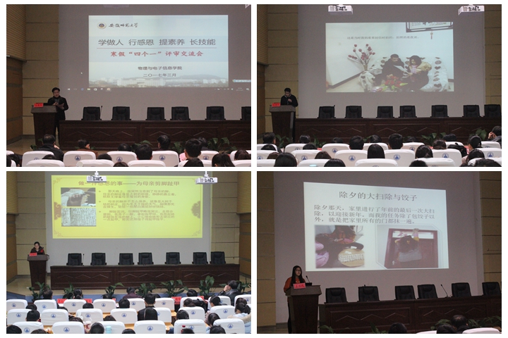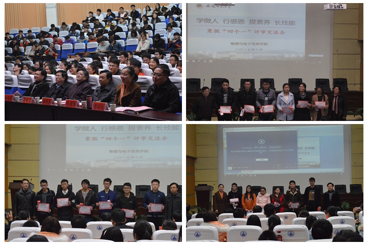 在2017年寒假围绕知、行、见、悟四个方面开展以 “一假一技能、一期一成长”为目标,以“学做人,行感恩,提素养,长技能”为主题的“四个一”主题实践活动,即做一件感恩的事、走访一位优秀校友或成功人士、书写一篇论文或提出一个专利想法、撰写一篇大学学习、生活心得。经过一个寒假的实施,学院共收到心得、图片、视频等各类寒假作业计3412件,科研论文、专利设计159篇。前期,各班级举办了“寒假归来话收获”等主题活动,择优推荐24名同学参与学院评选。