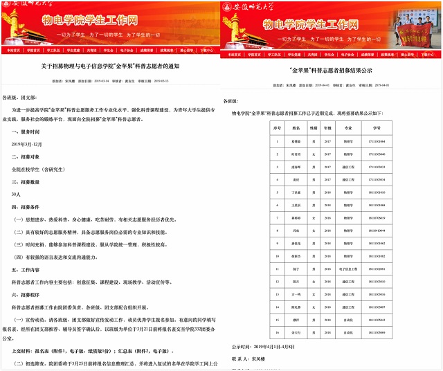 2018年起,学院尝试开展“金苹果”宣讲进中学、进幼儿园、进社区等系列活动,先后举办科普类活动20余场。今年3月份,在认真总结和客观分析前期工作的基础上,院团委在2017、2018级本科生中招收新一批课程建设志愿者30名。5月份,学院在往年优秀的支教、创新、社区服务类团队中进行深入摸底,整理力量、协调资源,成立“金苹果”科普总队1支、分队18支。