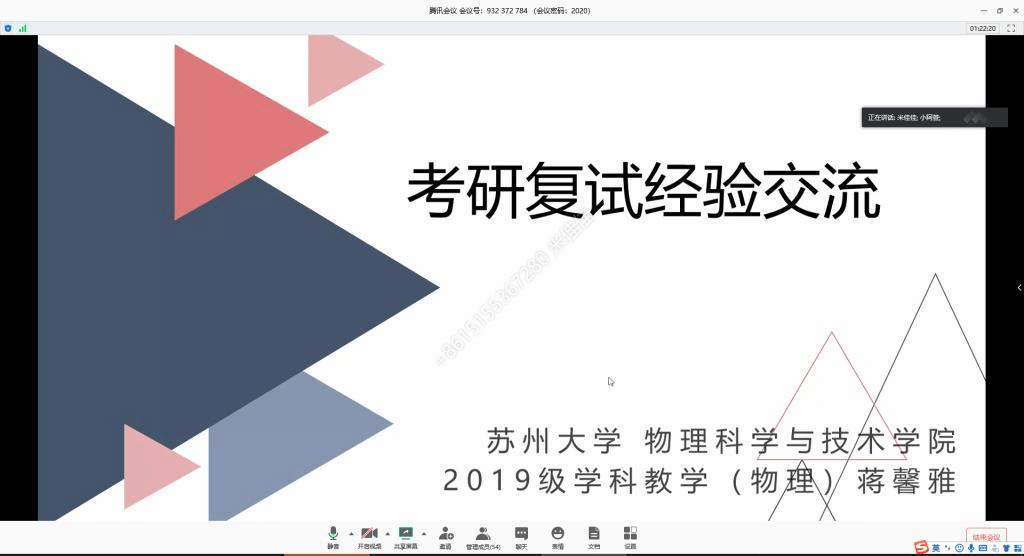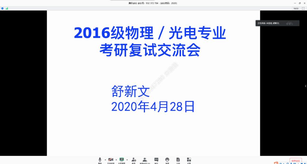 利用腾讯会议线上的方式,分工科(电子信息工程/自动化/通信工程)和理科(物理学/光电信息科学与工程)两个分会场,为即将参加复试或调剂的工科和理科的同学开展精准辅导。学院丁绪星教授、舒新文教授、毕业班辅导员、往届考研学生代表和各专业全体达线2020届毕业生参加线上指导会议。