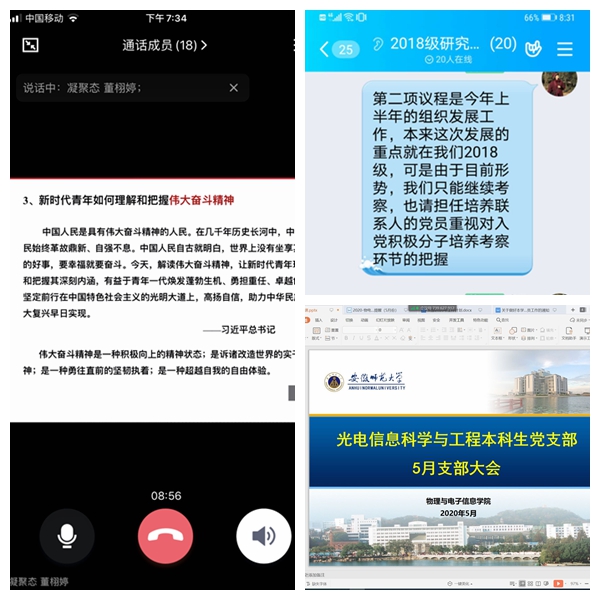 各支部组织学习传达了《习近平主持召开5月6日中共中央政治局常务委员会会议》及相关重要讲话精神,学习了《中国共产党巡视工作条例》以及有关省委来校巡视动员会讲话精神,及时跟进学习了《安徽师范大学2020年春季学期学生返校工作方案》和《关于做好本学期发展党员工作的通知》。