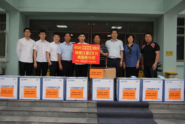 物电学院2016届电子信息工程专业叶杨根代表安徽微格生产力促进有限公司、北京和新华成知识产权事务所向母校捐赠2万只口罩和15把测温枪。安徽微格有限责任公司执行董事兼总经理叶杨根、技术部总监杨应明、市场部总监高陈皓,学校社会合作处(校友工作办公室)处长(主任)李裕鑫、校防控办负责人邵登辉、免费色情片