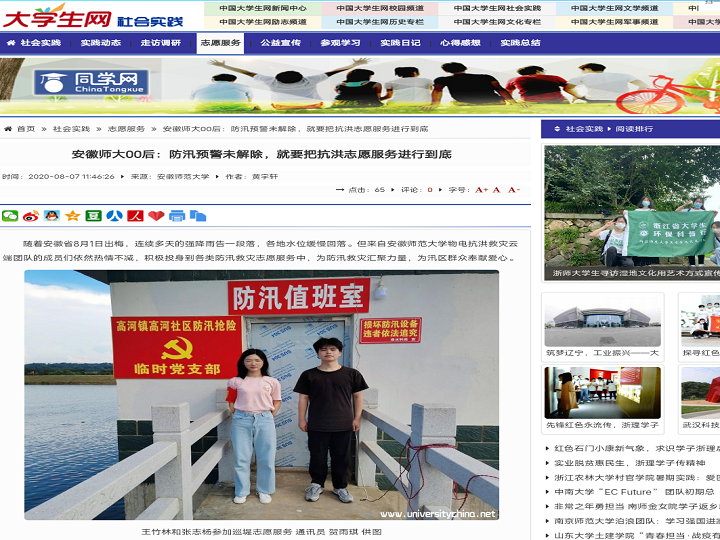 “作为一名青年团员,就应该把小我融入大我,到最需要的地方去。”2018级通信工程王竹林说,“每当佩戴起‘巡堤查险’红袖章时,堤后百姓就把安全交给了我。”一个小小的红袖章,让王竹林感受到身上沉甸甸的责任。2018级通信工程陈航通过采访枞阳县长河防汛负责人实地了解到一线情况,2019级电子信息类学生张志杨运沙袋固河堤,2019级电子信息类王澄暑期到南京探亲时主动请缨参与当地防汛救灾服务,同抗洪官兵们一起肩负起保卫家园的责任,筑起青春堤坝。