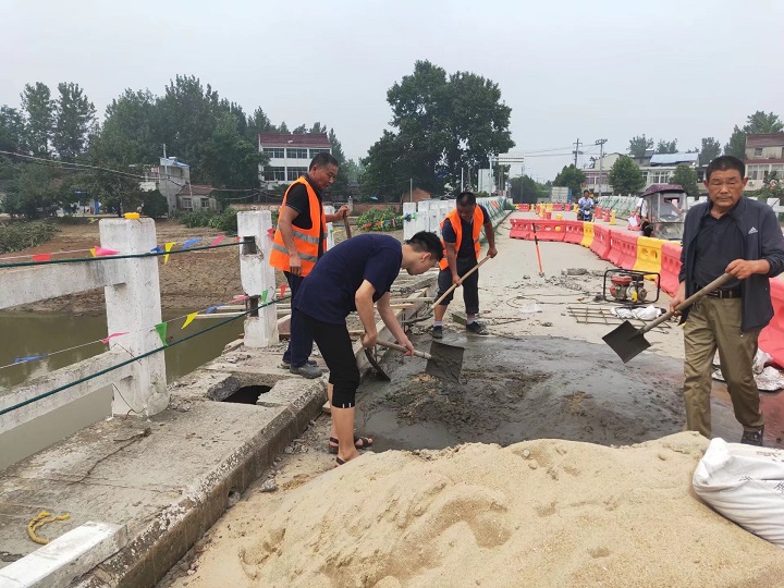 7月31日,全椒县古河镇修补遭洪水破坏的古河大桥,2018级电子信息张绪龙主动报名,拿起铁锹,与其他志愿者们参与桥面修复补损工作。