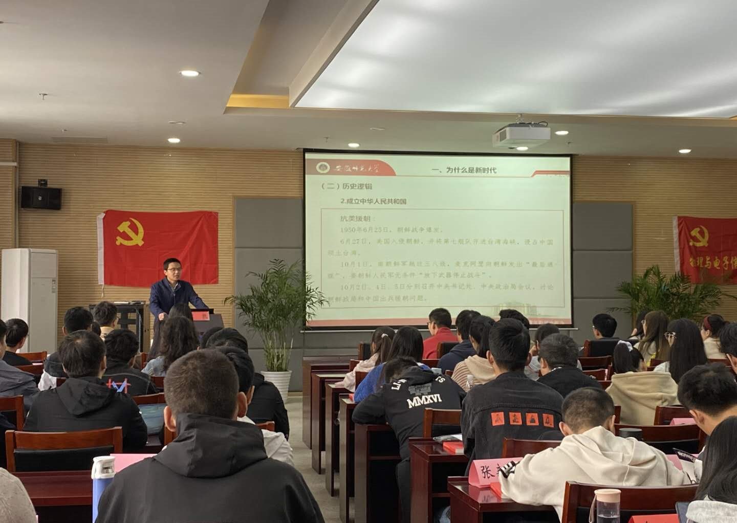 “一个会议改变一代青年人的命运”,汪凯老师以改革开放四十周年大会为引,就理论逻辑、历史逻辑和实践逻辑三个角度综合阐述,表明中国社会已经进入了一个新的发展时代,并结合自身切实体会,就“青年在新时代面临的严峻挑战”为题,向同学们分析了西方思想的渗透和多元思想文化思想对学生的影响。最后,汪凯老师向同学们提出三点希望:希望同学们能够坚定理想信念、认真学习知识、踏实努力工作。期盼大家能够早日成为青年突击队、青年志愿队的一员,奏响属于自己的青春之歌。