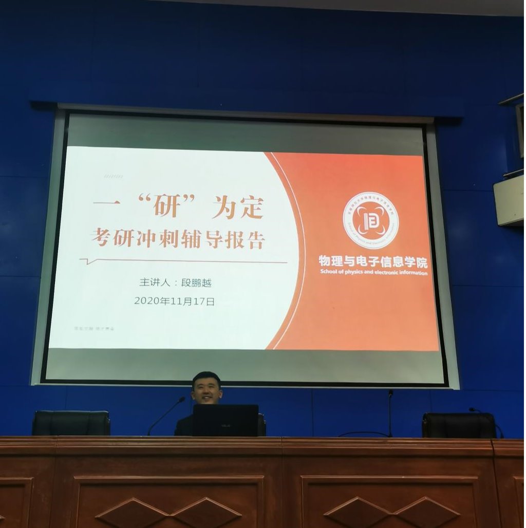 在敬文图书馆报告厅举办2021届毕业生一“研”为定考研冲刺辅导暨就业推进会。考研辅导专家段鹏越担任主讲。学院党委副书记黄友生、2021届毕业班辅导员宋凤楼、张杰以及全体2021届本科毕业生参加会议。会议由宋凤楼主持。