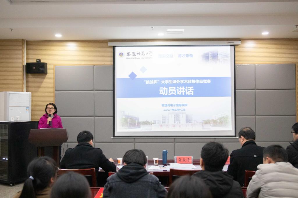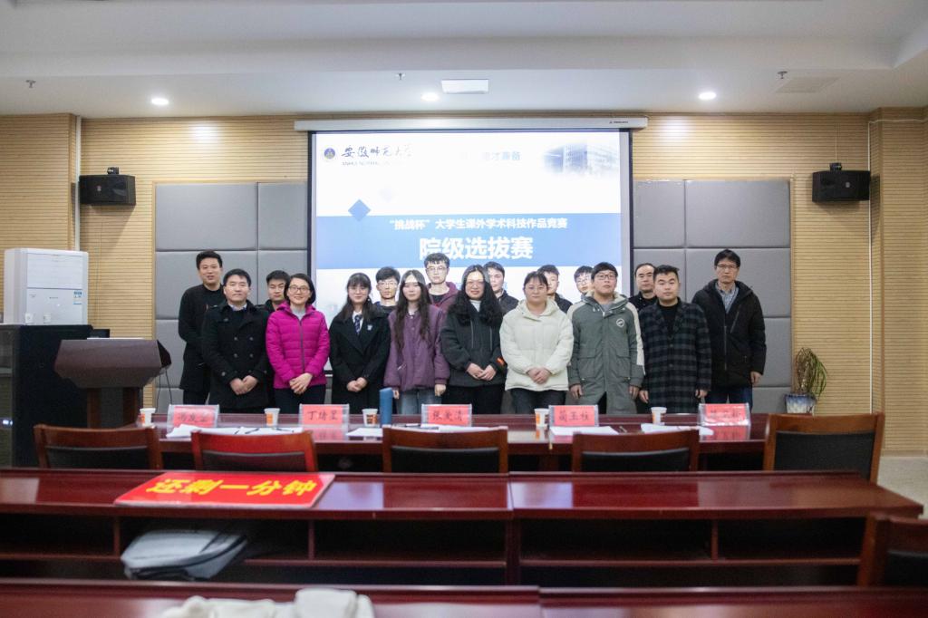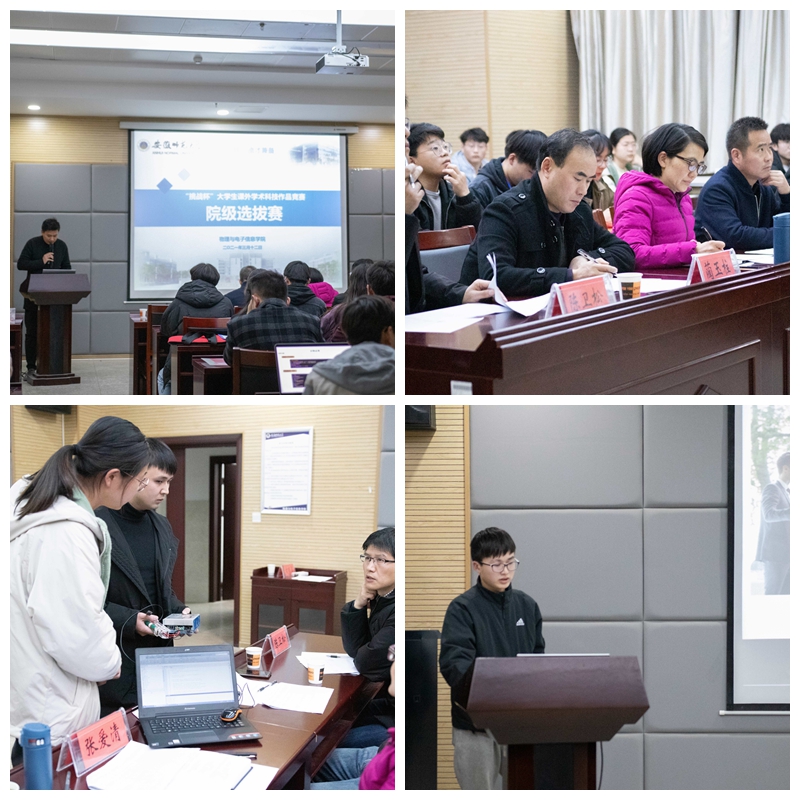 “挑战杯”大学生课外学术科技作品竞赛在物理楼335举办,副院长张爱清、学院工科实训中心主任蔺玉柱、学院专业教师丁绪星、陈卫松、冯友宏、学院团委负责人刘冠琪担任评委,比赛由学院辅导员张津源老师主持。
