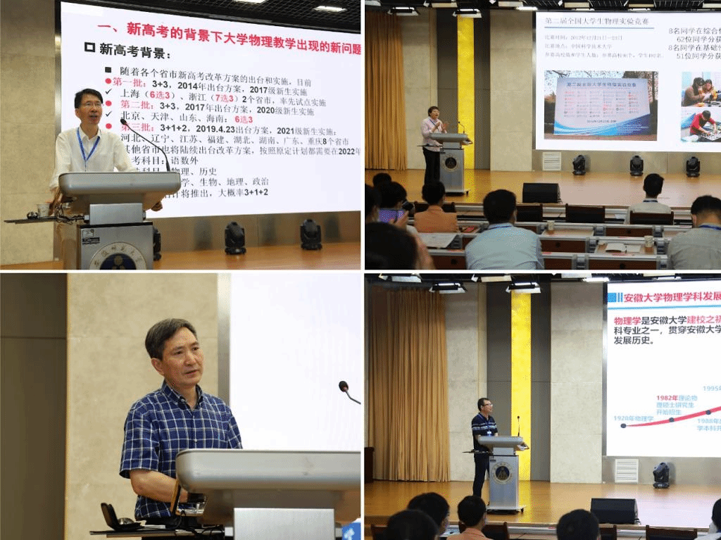 建设发展的关心与支持表示衷心的感谢。随后为本次比赛获奖教师颁发了获奖证书。会议还特邀了教育部大学物理教指委副主任、浙江工业大学施建青教授、中国科学技术大学孙腊珍教授、教育部大学物理教指委安徽省工作委员会副主任、安徽省物理学会副理事长、安徽师范大学黄时中教授、安徽大学李刚教授分别作了题为《新高考背景下能力导向的大学物理教育改革》、《以赛促教,提升大学物理实验教学水平》、《大学物理课程团队建设的做法和体会》、《安徽大学物理学科建设汇报》的精彩报告。