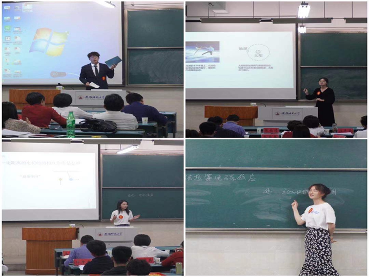 经过前期班级遴选,最终有17名选手进入院级决赛。在比赛现场,各参赛选手按照顺序依次进行模拟授课,分别采用现场试验、教学视频、师生互动等方法,开展了压强、机械功的含义及计算、力的合成、自由落体运动、弹力、声音的特性等课程的教学,带来了一场场趣味与教学并重的物理课堂教学,细致的内容和动情的讲解使现场师生仿佛置身在真实的课堂中。