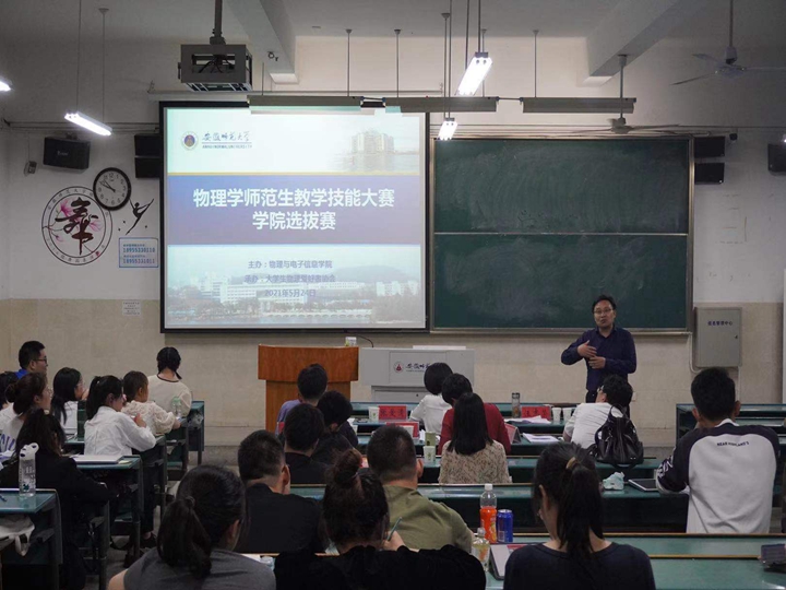 主办,大学生物理爱好者协会承办的物理学师范生教学技能大赛于5月24日晚7点在教学楼2010405教室举办。学院教学副院长张爱清,物理教师教育研究室主任汪志荣,专业教师王长江、姚关心、高爱英,物协指导教师邹孝龙担任此次大赛的评委。比赛由物协副会长程思维主持。