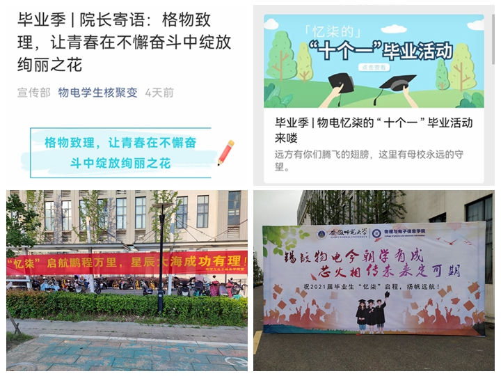 留下美好,“离别祝福”珍贵难忘。一张合影致青春,学院领导老师与同学们在敬文图书馆前合影留念,并提供专门定制的物电合影留念背景墙,为毕业生在留下珍贵瞬间,印刻美好记忆。一场晚会骊歌起,18日晚上,举办庆祝中国共产党成立100周年暨欢送2021届毕业生文艺晚会、制作“放心去飞”毕业祝福视频,隆重举行“最受学生喜爱的教师”“优秀毕业生”评选表彰。一件实事送一程,全体领导班子、专业负责人、辅导员深入学生宿舍走访慰问,为毕业生送去人文关怀,现场排忧解难。为每位毕业生购买了编织袋打包行李,定制了个性化的毕业纪念品。发动教师私家车、租用交通工具,帮助学生运送行李。积极推进、有力组织“为母校留下美好”毕业生宿舍清扫行动。