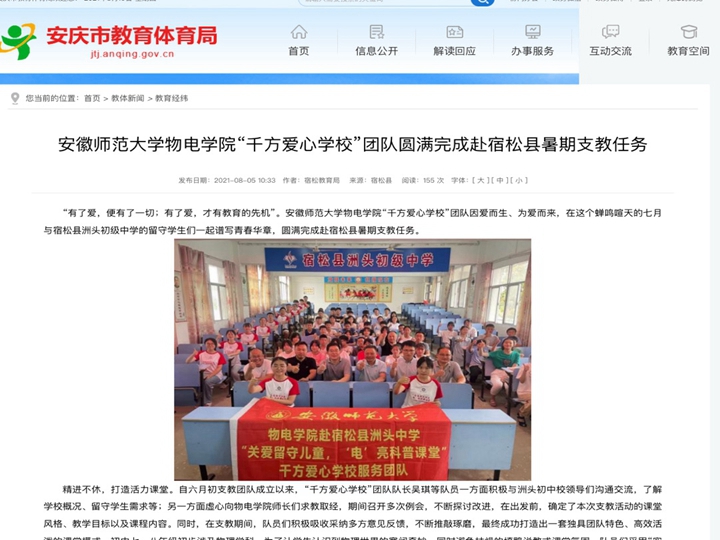 本网讯(千方爱心学校赴洲头初中支教团队)7月13日上午,安徽师范大学免费色情片 “千方爱心学校”赴宿松县洲头初中2021年暑期社会实践活动再起航。