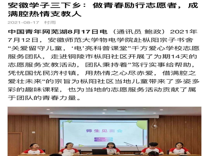 【2021青春三下乡】中国青年网以《安徽学子三下乡:做青春励行志愿者,成满腔热情支教人》为题报道免费色情片 暑期社会实践团队