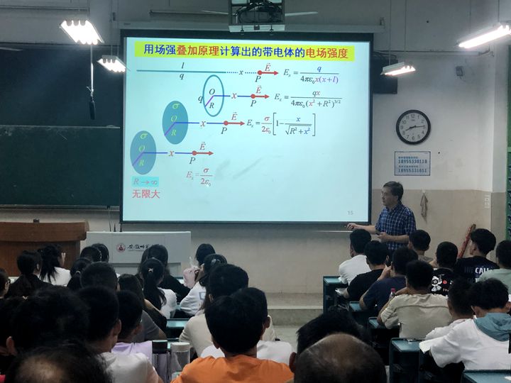 作为新学期的开学第一课,黄时中教授首先介绍了本学期的总体学习任务、考核形式和占比、学习要求、以及网课资源;随后对上学期已学过的重要知识点(一个定律——库仑定律、一个原理——叠加原理、一个定理——高斯定理)进行了系统的回顾,将学生从放假状态轻松自如地带进了物理学习状态。进入新课后,黄时中教授侧重介绍了联合应用叠加原理和高斯定理确定具有对称电荷分布的带电体所产生的电场中的电场强度的方法,结合一组典型实例,细致地解说了这种方法的关键步骤和要点,并总结出了这种方法的核心是“用叠加原理定方向,用高斯定理定大小”。在整个教学过程中,保持了良好的师生互动,课堂氛围十分活跃。