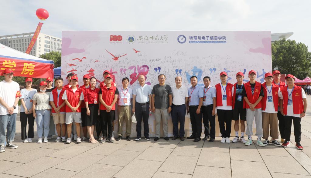 一字摆开的展台上展列着物电学子亲自制作的科技作品40余件,从工科学生研发的舞蹈机器人、合作机器人、激光雕刻机、自平衡智能车、四轴飞行器、温度检测调节系统到物理师范生自制的电动机演示板、库伦定律演示仪、自制安培力演示仪等物理教具作品,通过学生志愿者专业演示与讲解,吸引许多新生和家长驻足观看。此外学院育人品牌项目、历年考研光荣榜、学院学生社团活动展示等也在潜移默化中让专业“第一课”深入人心。