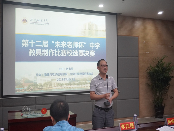 物理教师教育教研室主任、硕士生导师汪志荣老师作点评讲话。他指出,本次大赛的所有作品都能够结合所学的专业,聚焦中学学科教学,贴近教学实际。他强调,教具的制作也是师范生锻练动手实践能力,提高大学生学科素养的重要途径。他对参赛选手关注教育改革发展和重视新课标核心素养的行为表示赞赏,同时并指出选手们在汇报过程中的不足之处和提出改进意见,希望选手们可以进一步提高作品的安全性、创新性、稳定性和实用性,不断完善性能并积极申请专利,争取将成熟产品在市场推广。