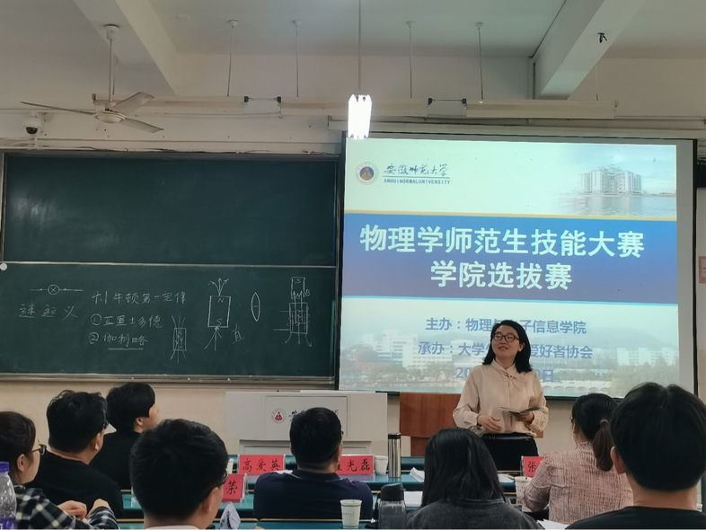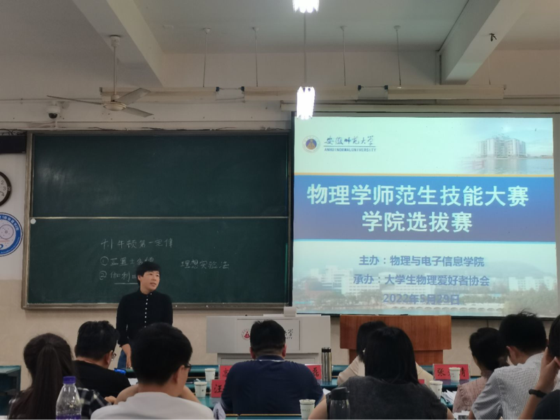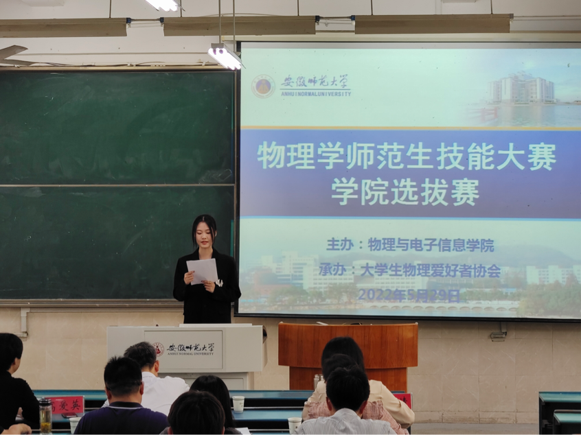 主办、大学生物理爱好者协会(以下简称“物协”)承办的物理学师范生教学技能大赛于教学楼2010206成功举办。校教务处副处长崔光磊,学院教学副院长张爱清,物理教师教育研究室主任汪志荣,专业教师姚关心、高爱英、徐玲、物协指导教师曹阳担任此次比赛的评委。本次比赛由物协宣传部吕少洋主持。
