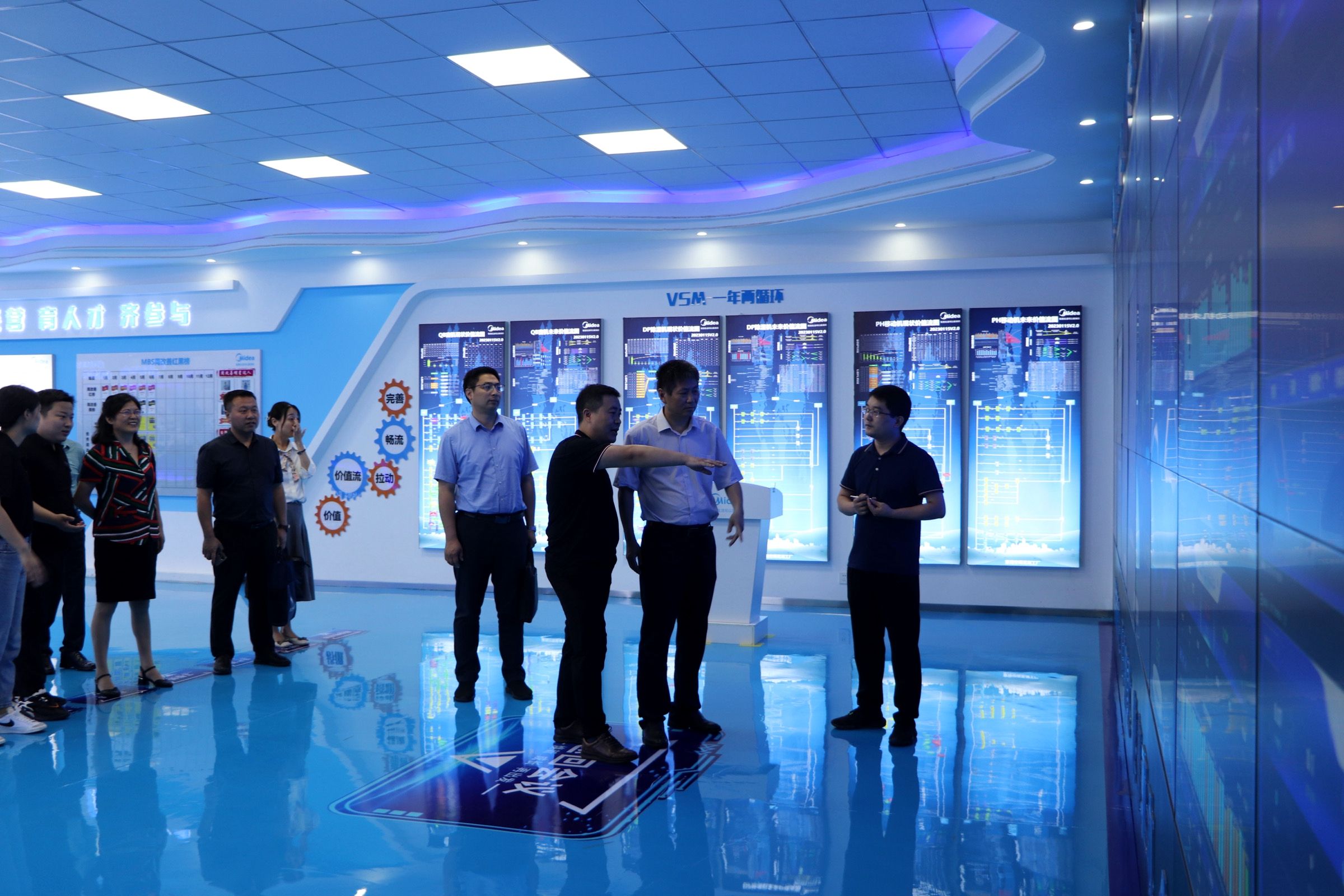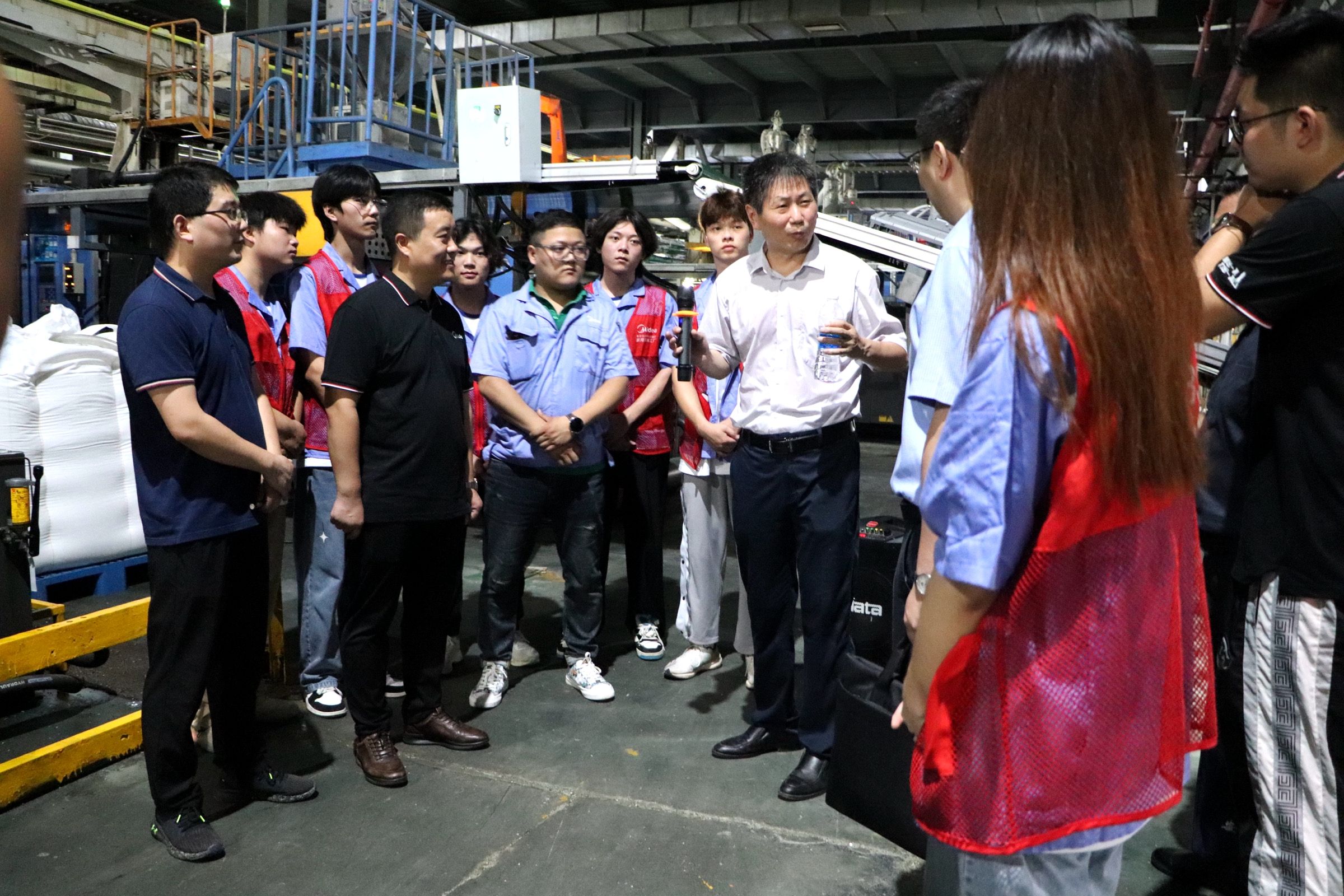 景晓军一行参观了精益道场、产品工作坊、注塑车间,现场就产品、技术、企业发展和工作人员进行了交流。参观过程中,景晓军一行听取了实践学生周改善项目汇报,汇报学生从问题发现、问题分析、问题改善方案、改善前后对比等方面介绍各自负责项目的情况。景晓军在项目点评中指出,要在细小处找抓手,提高自己理论与实践结合能力,在学习中实践,在实践中学习。参观结束后,景晓军一行与芜湖美智公司人员开展座谈,会上,芜湖美智空调设备有限公司校企合作负责人吴心雨介绍了美的企业基本情况以及美的人才培养理念。实践学生代表宋雨晨、魏薇汇报了参加专业实践的收获与体会。