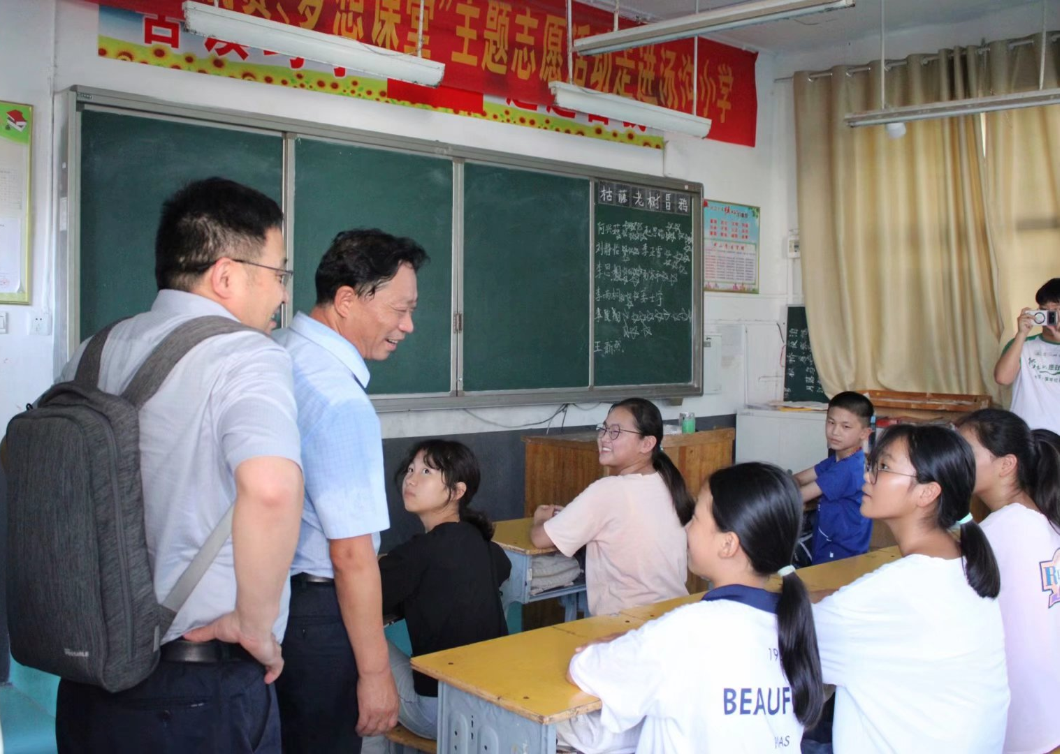 在阜阳汤沟小学,张其芳一行详细了解了实践团队的生活工作环境,认真听取了队员们针对支教工作开展情况的汇报,与实践队员们交流了心得体会。他充分肯定同学们这一周来付出的努力和取得的成效,赞扬了队员们吃苦耐劳的优秀品质,勉励队员们继续保持良好的教学状态和认真负责的工作态度,助力学生成长,为学生树立一个无私奉献,具有社会责任感的师大学子形象。