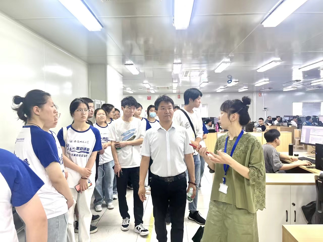 在芜湖埃泰克汽车电子生产一线,冯友宏老师与实践队员们一道了解工厂生产流程,仔细询问队员们实践期间所进行的实习岗位以及工作内容,听取每位实践队员的学习体会。冯老师叮嘱实践队员们在社会实践中要有所收获,做到精诚团结、集思广益,发挥团队凝聚力。