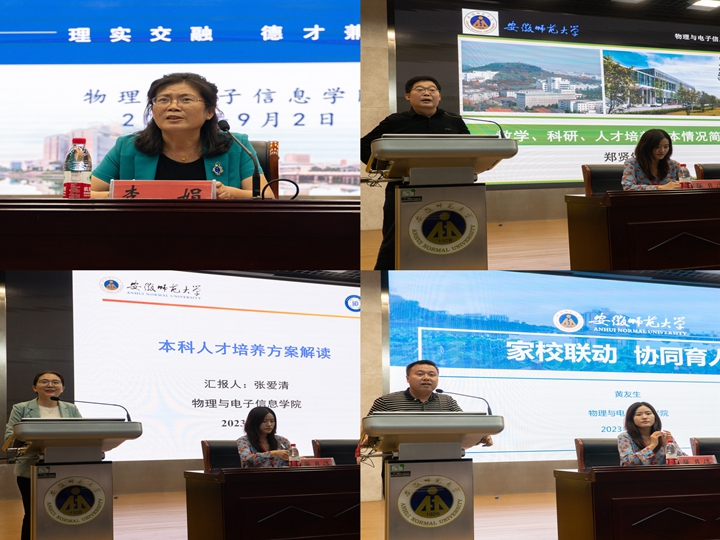 会上,郑贤锋详细介绍了学院教学、科研、人才培养的基本情况,他指出学院本硕博一体化办学、师资队伍、实验室、学科科研平台等完全能满足学生学习成长发展需求,希望家长们安心、放心,全力支持和配合学院育人工作;张爱清就学院本科人才培养方案进行全面分析,她就“学分”“绩点”“第二课堂”“课程设置”等进行解读,呼吁家长重视学生在校学习情况,积极配合学院和辅导员做好学生学习工作,争取做到“一个都不掉队”“一个都不能少”;黄友生以“家校联动 协同育人”为题,从“我们是谁?”“我们做什么?”“我们怎么做?”“我们需要您做什么”四个方面展开,结合《安徽师范大学学生违纪处分规定(修订)》、《安徽师范大学普通全日制本科毕业学士学位授予办法(修订)》等文件,详细介绍了学生管理“四项禁令”、校园文明“十不为”、明德修身“十学会”,强调了学生日常思想政治教育和学生基础文明素养养成的重要性,希望家长对学校“信赖不依赖”、对孩子“关爱不溺爱”、教导孩子“惟学不唯书”,合力把孩子培养成德智体美劳全面发展的新时代好青年。