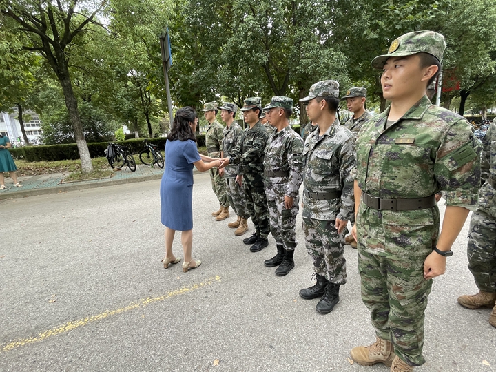 李娟代表学院向承训教官表达最真挚的问候,并对承训教官的辛勤付出致以诚挚的感谢。她在讲话中强调,军训是开启大学生活的“开学第一课”,更是一次重要的思政教育,有利于增强新生的国防意识、团结意识和纪律意识。希望承训教官继续严格施训、科学施训、安全施训,培养学生不怕苦不怕累的精神,认真上好这堂爱国主义教育,通过军训磨炼意志、增强体魄;同时也叮嘱各位承训教官要积极引导学生,把在军训期间养成的良好品德和优良作风内化于心、外化于行,以更饱满的精神面貌投入今后的学习和生活,努力学习专业知识,坚持体育锻炼,成长为可堪大用的新时代好青年。