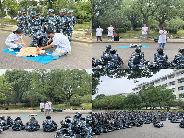 李娟、黄友生来到军训场地,看望正在参加急救知识教学课程的2023级全体新生。