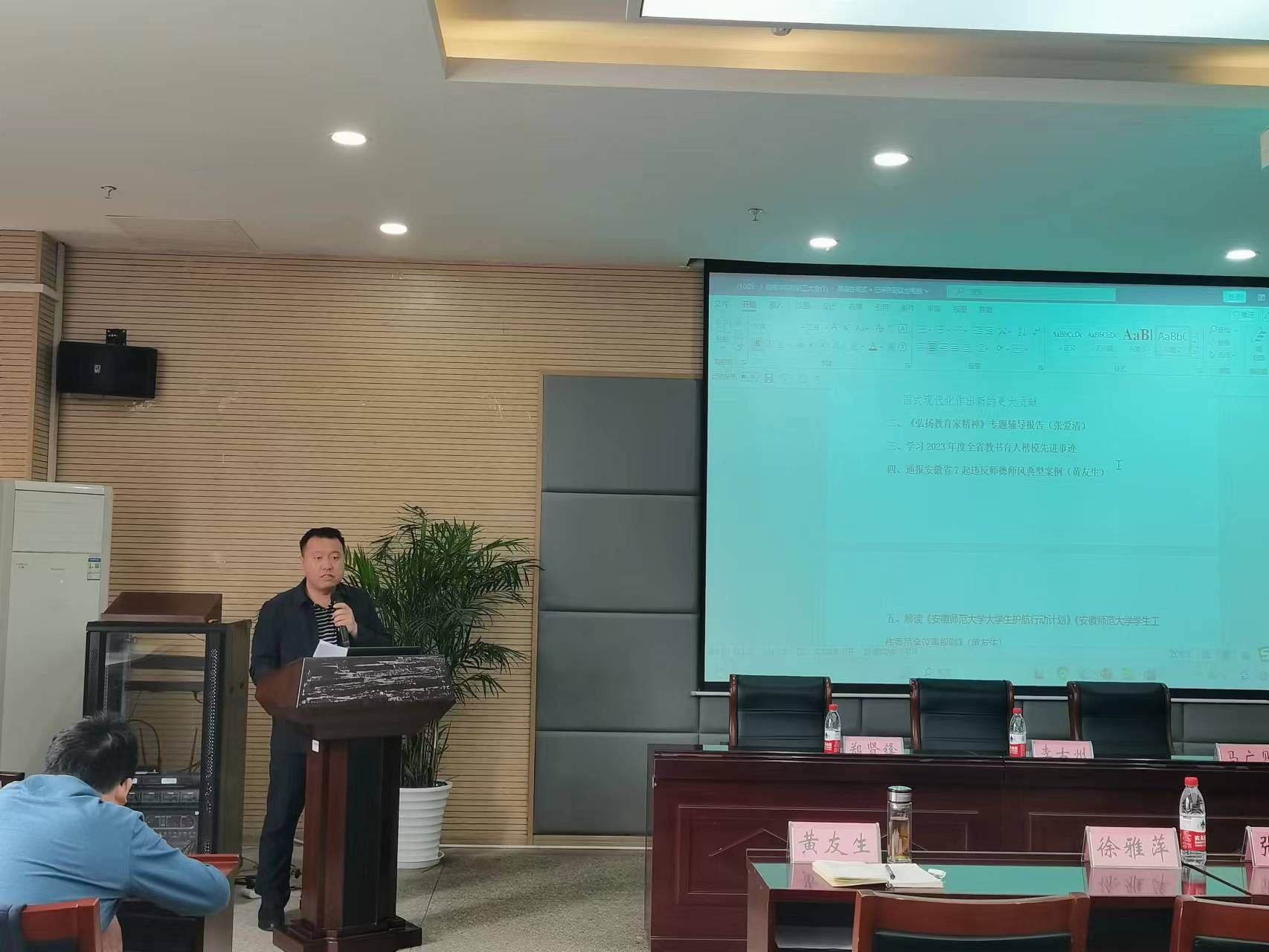 院党委副书记黄友生通报近期全省高校系统曝光的7起违反教师师德师风的反面典型案例,开展师德师风警示教育。随后,他对《安徽师范大学大学生护航行动计划》作了传达解读,他指出,此计划是学校为落实立德树人根本任务,推进“时代新人铸魂工程”,深化“三全育人”,强化“五育并举”,着力培养担当民族复兴大任的时代新人的创新举措。学院将全面贯彻落实学校部署要求,切实做好学院学生发展护航行动计划的有关工作。