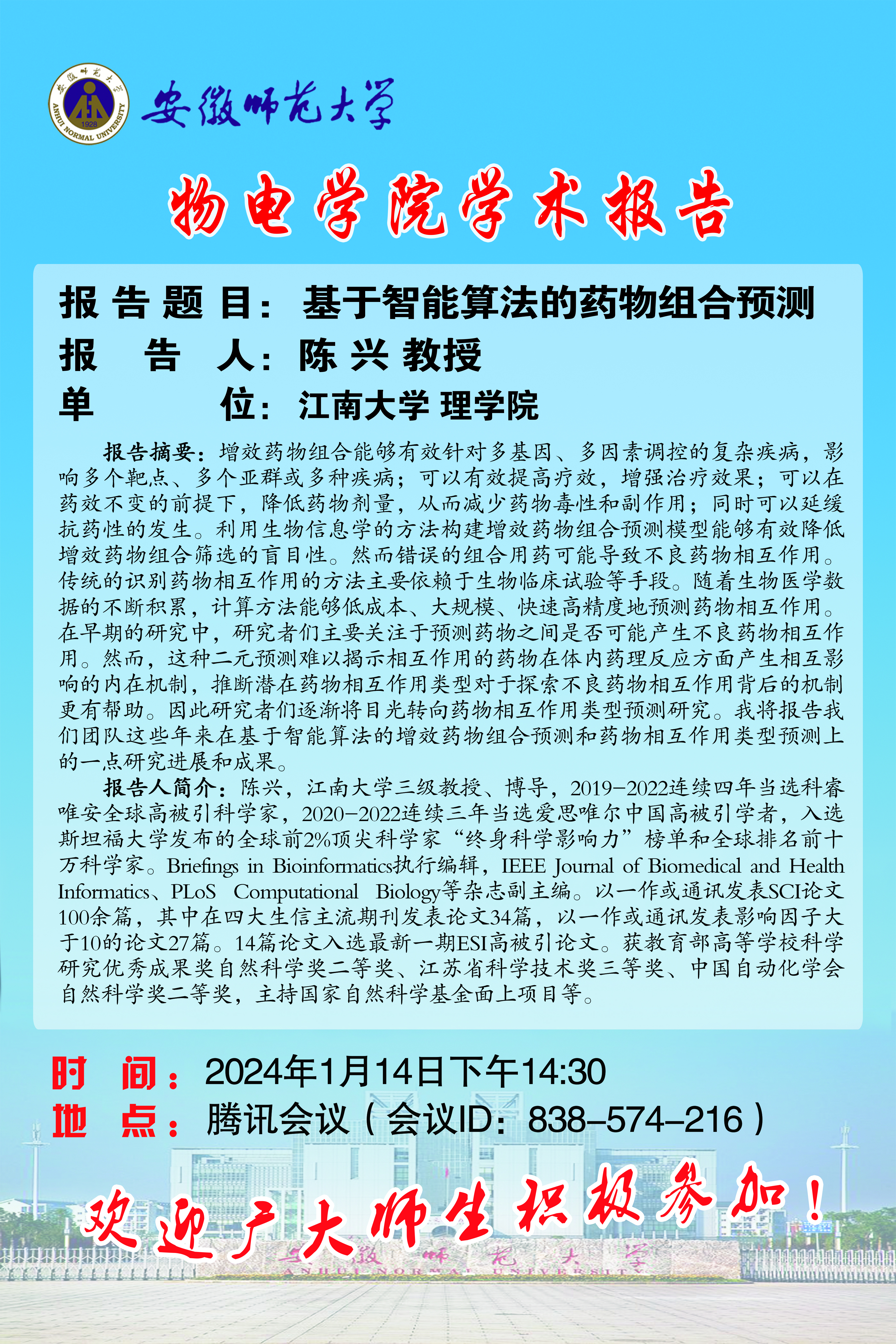 地址:花津校区-安徽省芜湖市九华南路189号 邮编:241000 电话:0553--3869894