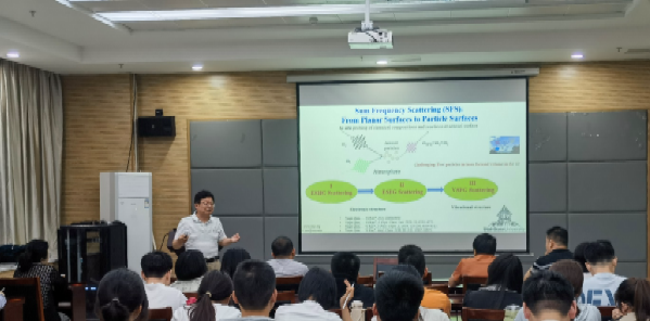 在报告会上饶毅教授介绍了液滴及其表面性质在生物学、医学、生产、催化、环境和大气科学中的广泛应用。然而,许多分析液滴及其表面的方法存在破坏性、非表面特异性、在非自然环境下进行、需要样品基底等问题。因此,需要一种在任何条件下都能进行表面特异性原位分析的技术。有鉴于此,饶毅教授阐述了其科研团队近年来在空气中气溶胶滴界面分析中二次谐波光学散射技术的最新发展,并将电化学与高灵敏度和超快速的原位和频生成(SFG)光谱学相结合,用于研究金电极上的CO2还原反应。首次,在金表面上定量确定*CO中间体的取向角度。此外,由于系统的超快速性质,观察到了由于中间体在表面的覆盖密度而产生的生成和扩散动力学。这项工作利用SFG的原位表面特异性,为金表面上CO2还原的电化学机制提供了新的见解,为将其应用于许多其他电化学系统奠定了基础。报告会结束后,与会师生和饶毅教授就相关问题展开了热烈的讨论和交流。