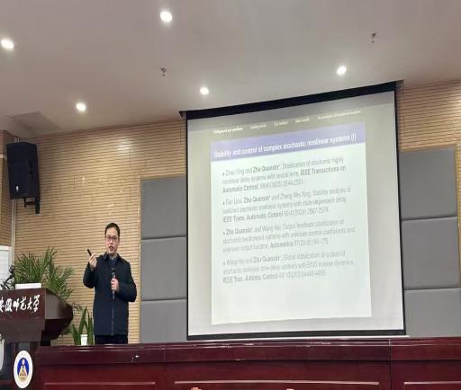 报告会上,朱全新教授讲述了随机非线性系统控制问题研究一直是控制理论与工程领域的一个重要研究课题。在本次报告中,朱教授介绍了具有外部扰动的随机非线性时滞系统的事件触发反馈控制问题。通过引入输入到状态实际稳定性的概念和事件触发策略,建立了系统的输入到状态实际上指数均方稳定性。此外,通过设计反馈增益矩阵和事件触发反馈控制器来研究系统镇定性结果,该控制器用线性矩阵不等式表示,进一步得到了所提出的事件触发控制方法的执行间隔时间的下限。最后,给出了数值例子来证明所提出方法的有效性。与离散时间随机系统的大量结果相比,连续时间随机系统事件触发控制的结果很少。报告会结束后,与会师生和朱全新教授就相关问题展开了讨论和交流。