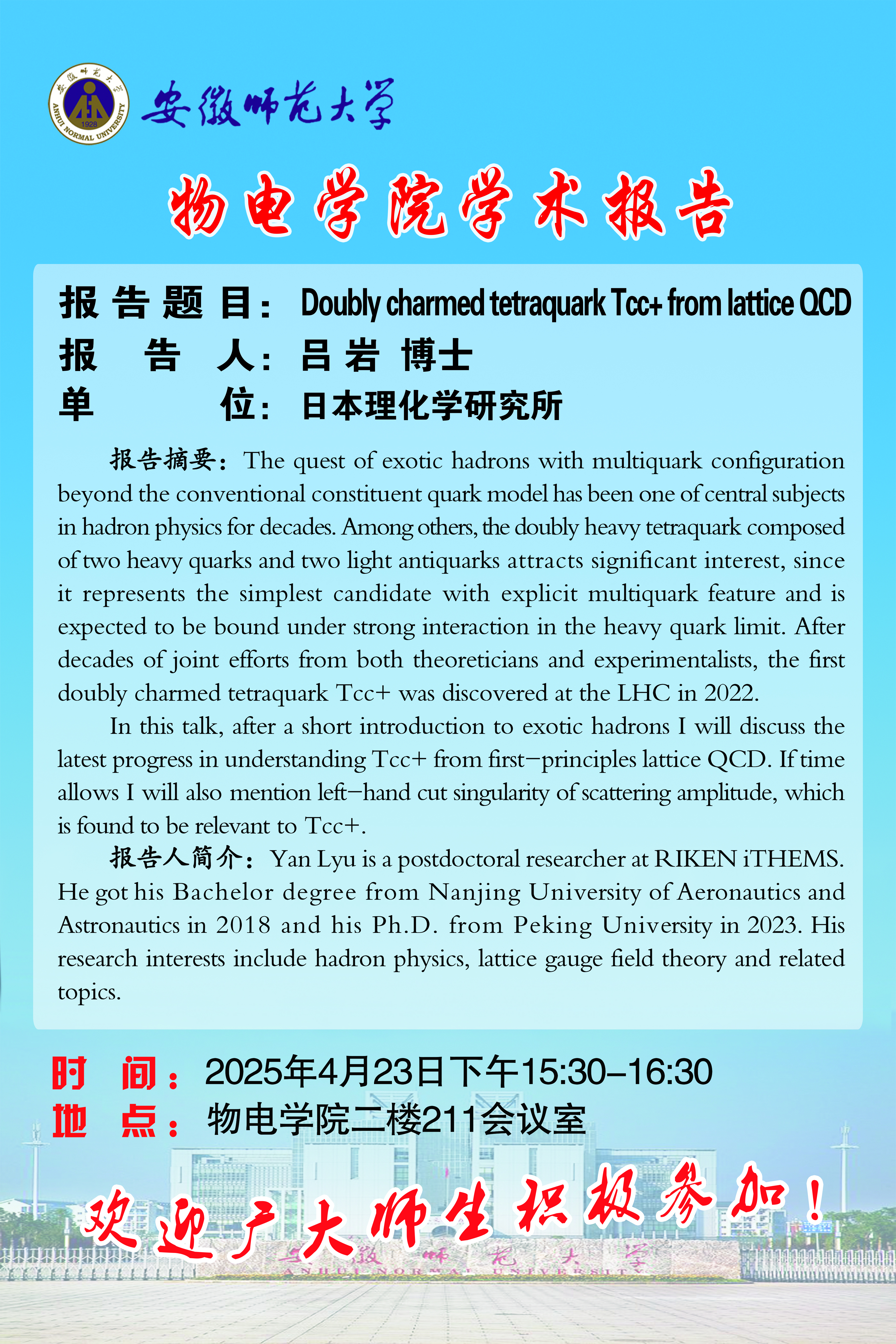 【学术预告】物电讲坛2025年第18期:Doubly charmed tetraquark Tcc+ from lattice QCD