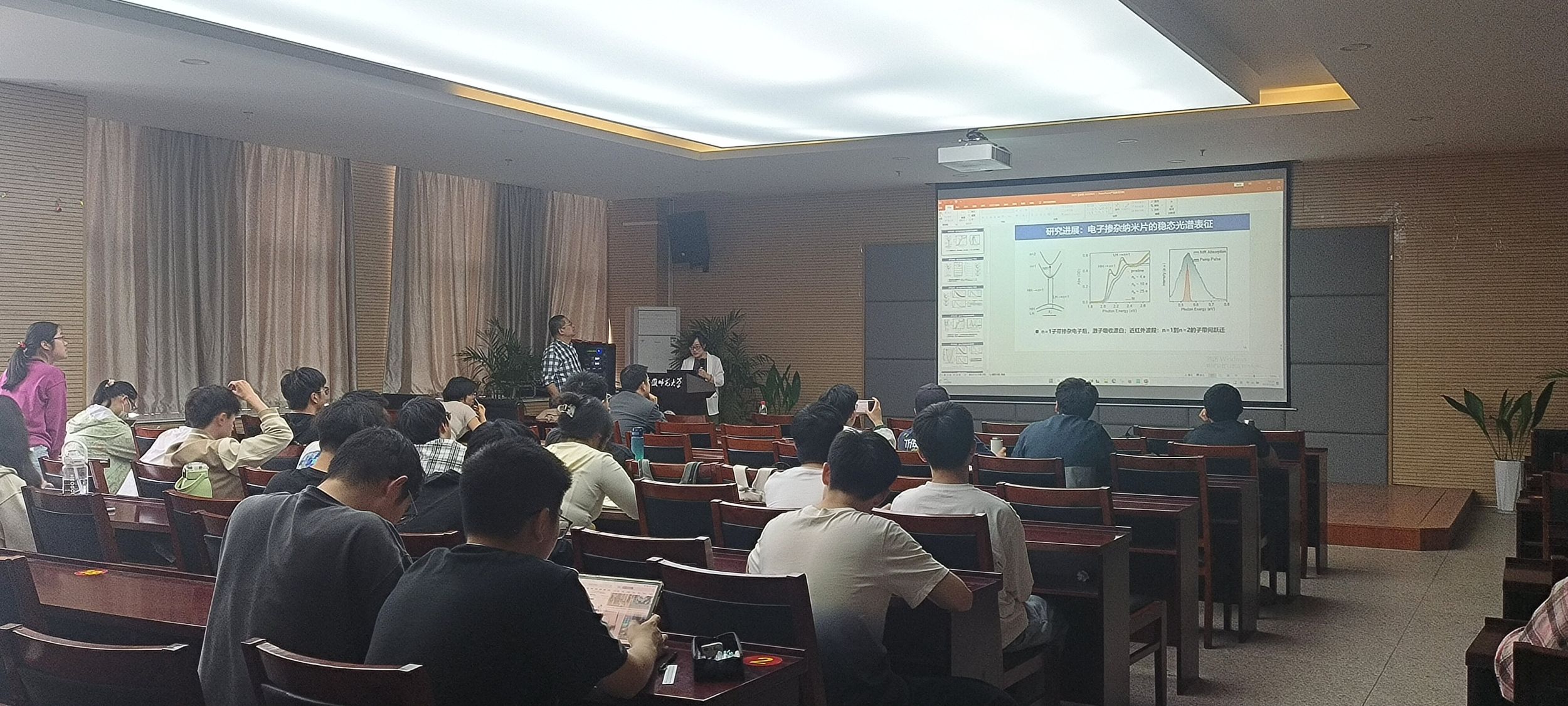 王俊慧研究员在报告中系统阐述了其课题组在低维光电材料的激子、载流子及自旋超快动力学及其在新型能源中的应用,该应用将推动光伏、光电探测、发光器件和能源催化领域的发展。同时,讲述了围绕新型能源转换中存在的动力学难题,利用超快谱学方法,通过构建和设计体系并对其界面电荷/能量转移等动力学过程进行精准测量及调控,最终提炼光电/光化学转换新机制。主要内容有:在零维量子点和二维纳米片中通过元素掺杂和电子掺杂实现了热电子弛豫“自旋阻塞”和“声子瓶颈”现象的观测,使得热电子寿命显著延长。基于电子掺杂纳米片体系,提出了电子-声子散射主导的本征热电子弛豫机制,并揭示了自旋翻转寿命调控电荷复合路径的动力学机制,并将该调控机制用于构建单电荷转移体系,率先观测到了低维材料电荷转移的Marcus反转区间。报告会结束后,与会师生就相关问题同王俊慧研究员进行了讨论和交流。