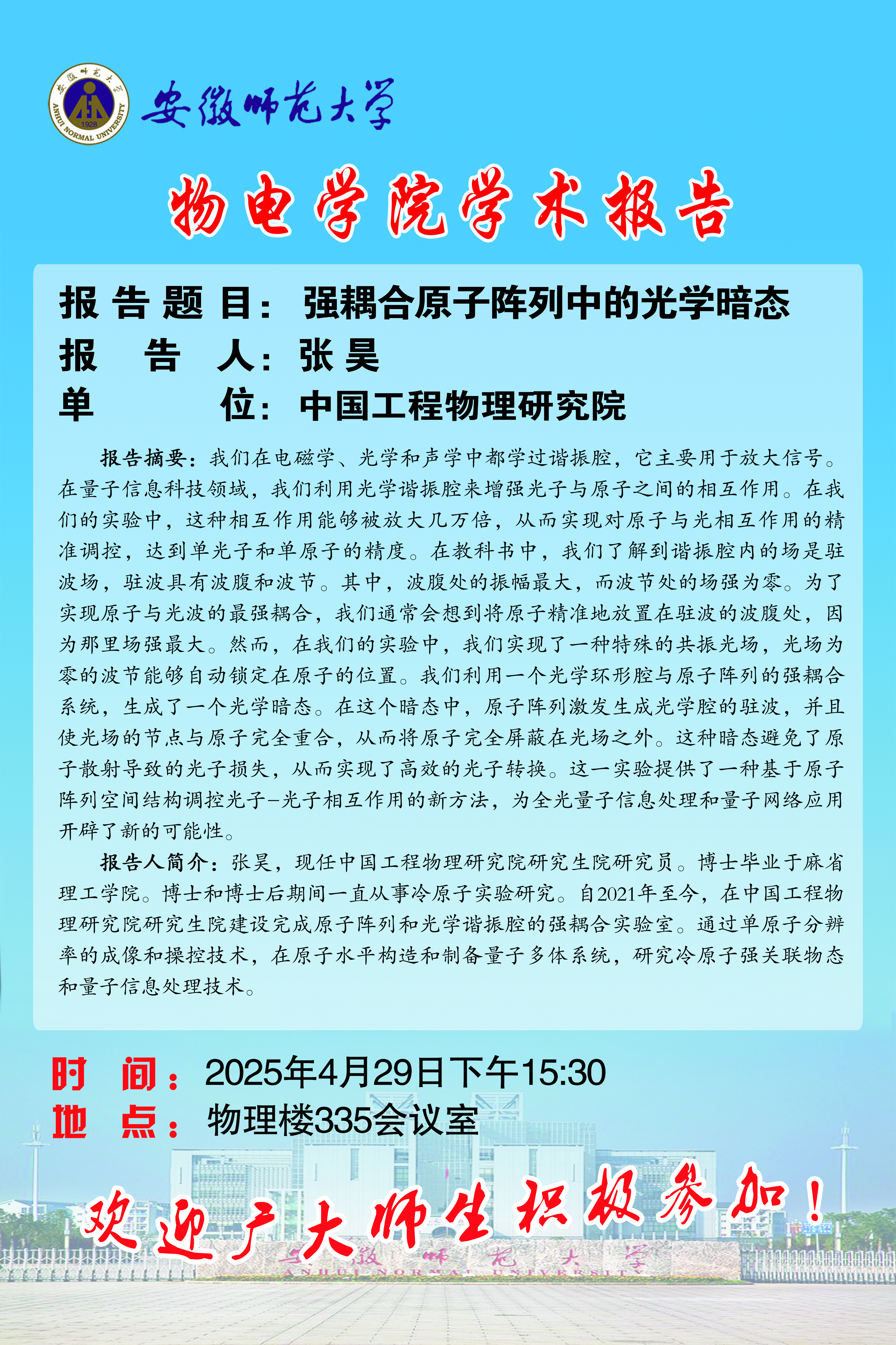 地址:花津校区-安徽省芜湖市九华南路189号 邮编:241000 电话:0553--3869894
