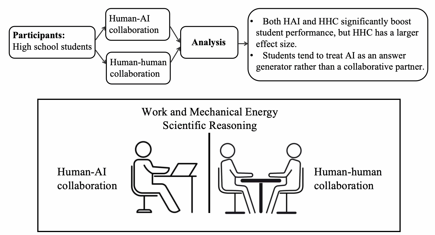 研究团队在一所重点高中招募了120名高一学生,将其随机分为两组:一组学生通过与同学合作(HHC)完成任务,另一组则与ChatGPT-4o协作(HAI)。任务涵盖科学知识(Work and Mechanical Energy)与科学思维(iSTAR)两个维度。结果表明,两种协作方式均能显著提升学生的测试表现,但传统的人际协作(HHC)在效果上略胜一筹。此外,研究还发现多数学生更倾向于将AI工具作为“答题器”使用,而不是充分与之互动交流。这种单向的互动方式限制了AI工具的教育潜能。因此,研究呼吁教育工作者加强对学生的AI协作培训,提升其与AI展开深度对话与批判性思维的能力。